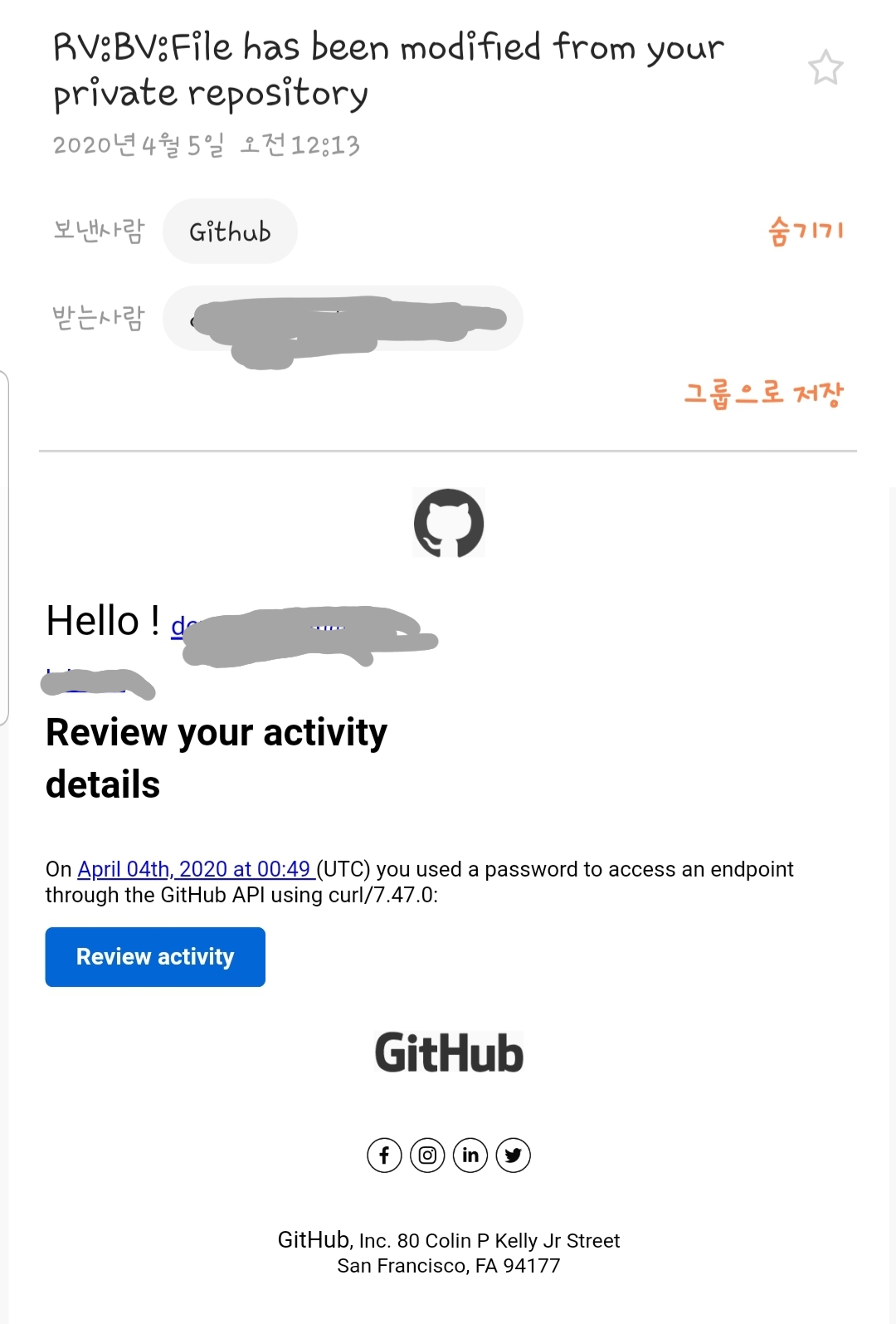 실제 제가 github에서 사용하고 있는 메일 주소로 아래와 같은 메일이 왔습니다.