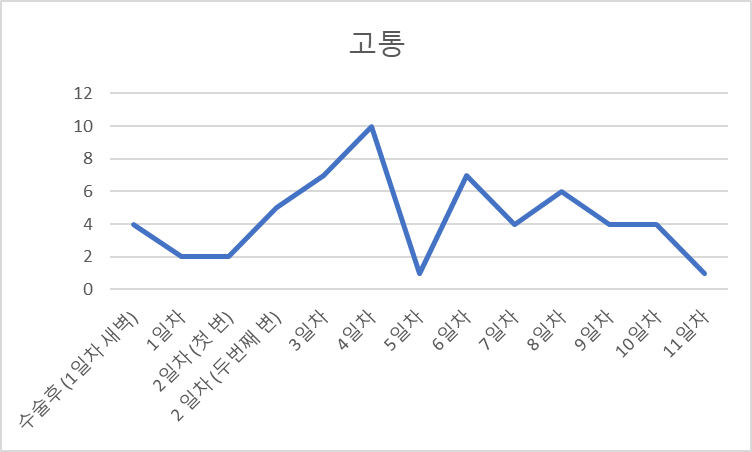 그동안의 (변을 볼 때의) 고통의 정도를 최대 10으로 정해 놓고 그래프를 그려 봤더니 아래와 같다. 그래도 추이를 보니 고통이 줄고 있어 보인다.